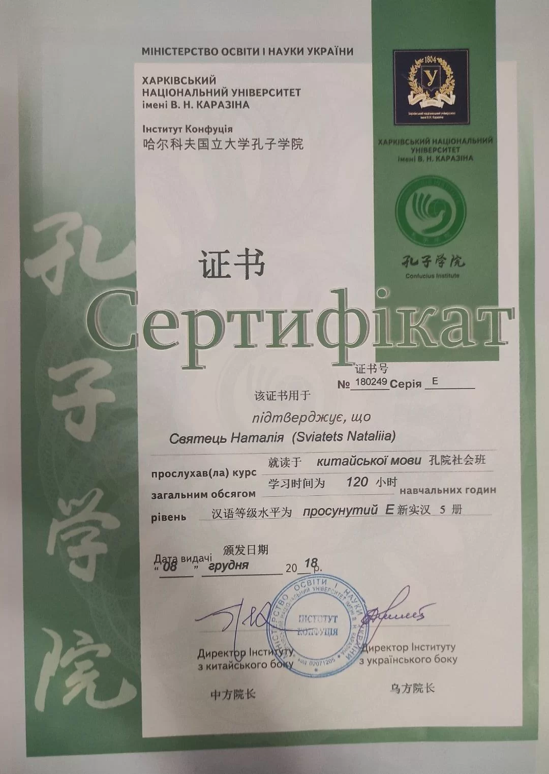 Certificate No. 180249 of completion of student courses (level E) at the Confucius Institute at the Kharkov Karazin National UniversityDecember 18, 2018