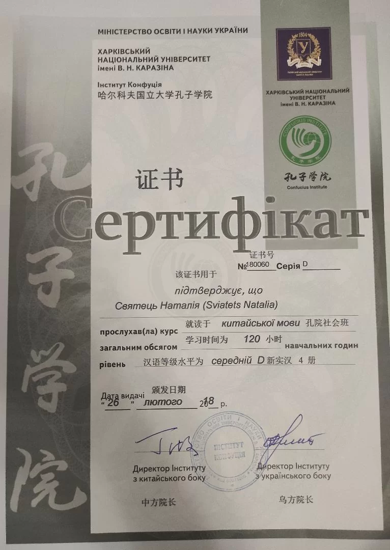Certificate No. 180060 of completion of student courses (level D) at the Confucius Institute at the Kharkov Karazin National UniversityFebruary 26, 2018