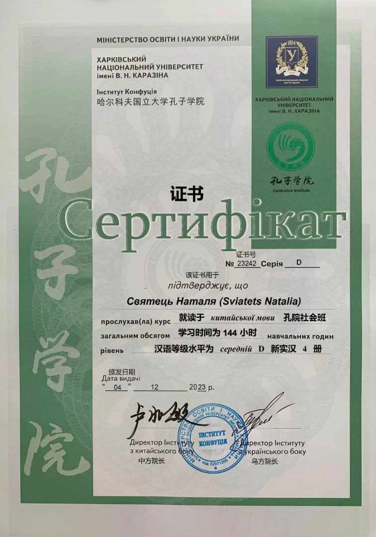 Certificate No. 23242 of completion of student courses (level D) at the Confucius Institute at the Kharkov Karazin National UniversityDecember 04, 2023