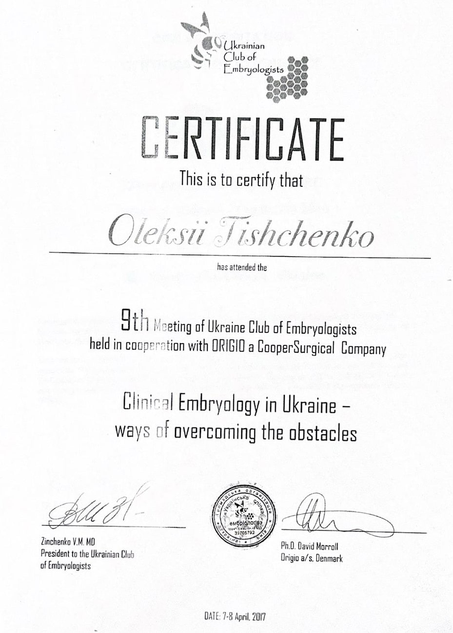 Certificate of participation in the 9th meeting of the Ukrainian Embryology Club "Clinical Embryology in Ukraine ― ways of overcoming the obstacles"