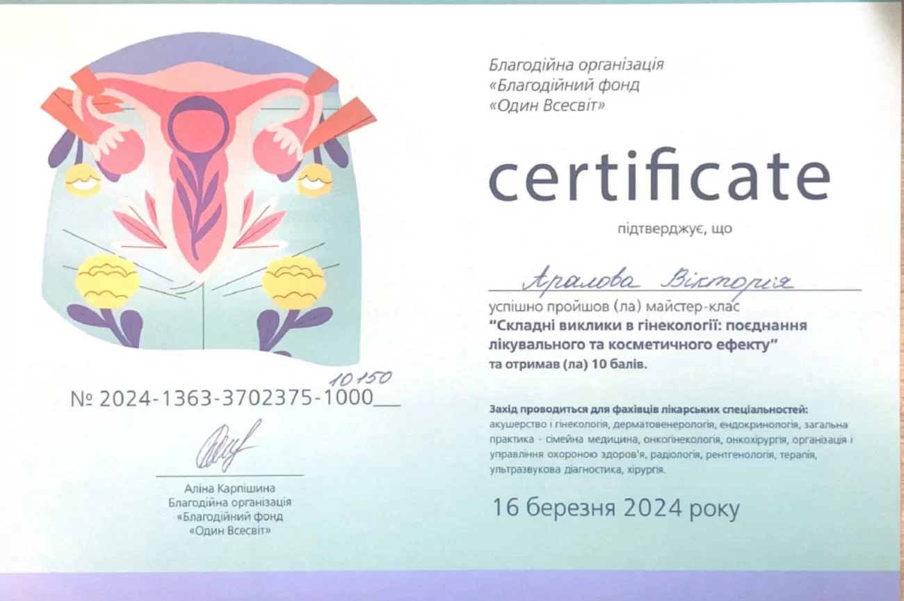 Certificate on successful participation in the workshop "Challenges in gynecology: combining therapeutic and cosmetic effects" No. 2024-1363-3702375-10150