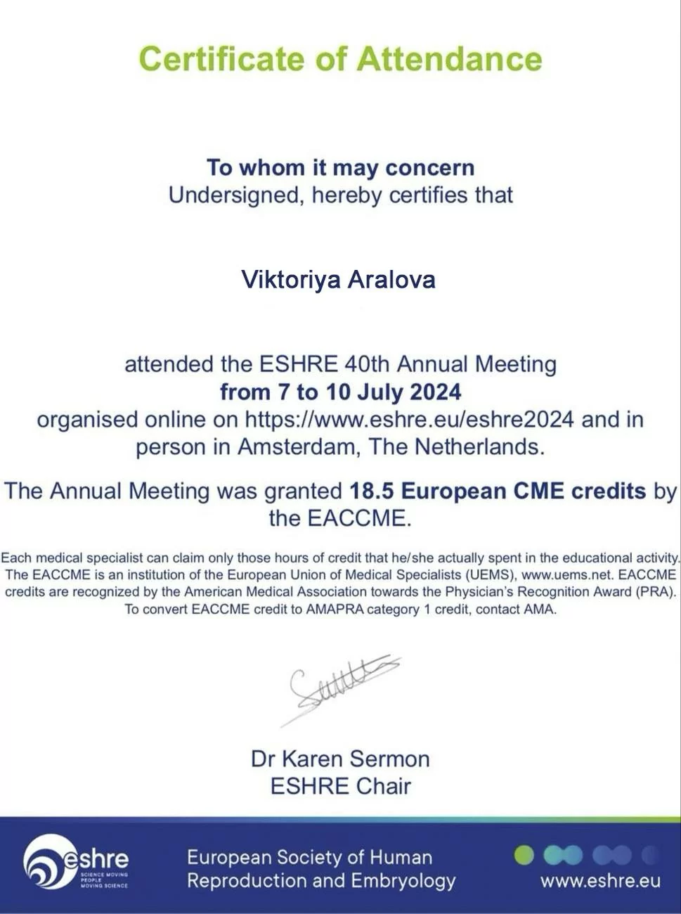 • Certificate of compliance issued by the society of reproductive medicine (ESHRE) on participation in the 13th course held by the society, which took place in Copenhagen (Denmark) on 25 June 2023