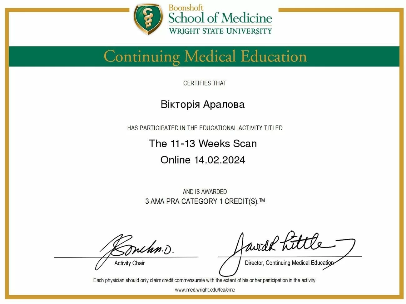 She took part in an educational Online event called “The 11-13 Weeks Scan”, for which she received a certificate of participation
