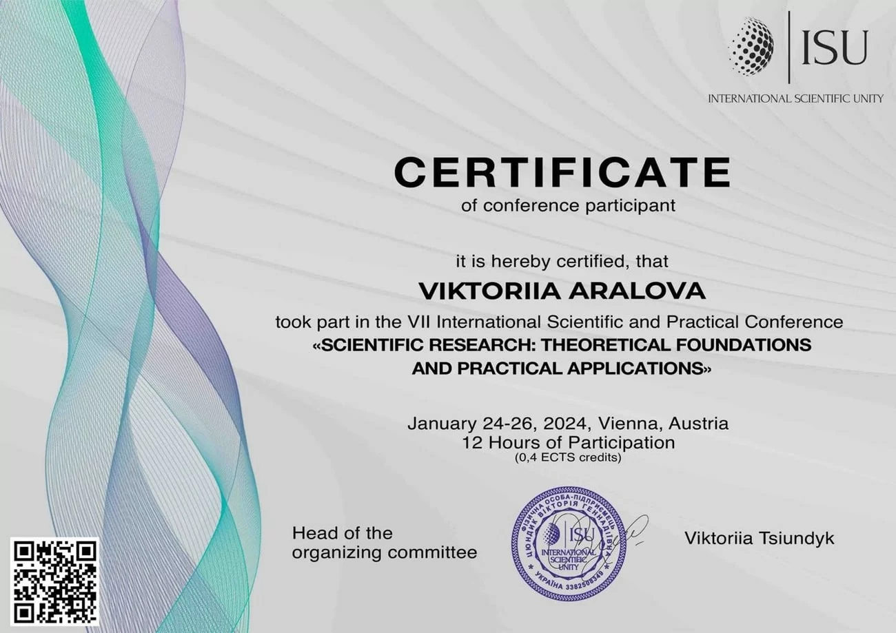 The VII International Scientific and Practical Conference "Scientific Research: Theoretical Foundations and Practical Applications" was held, where Victoria Olegovna took an active part. This is confirmed by the participant’s certificate. (VII International Scientific and Practical Conference "SCIENTIFIC RESEARCH: THEORETICAL FOUNDATIONS AND PRACTICAL APPLICATIONS")