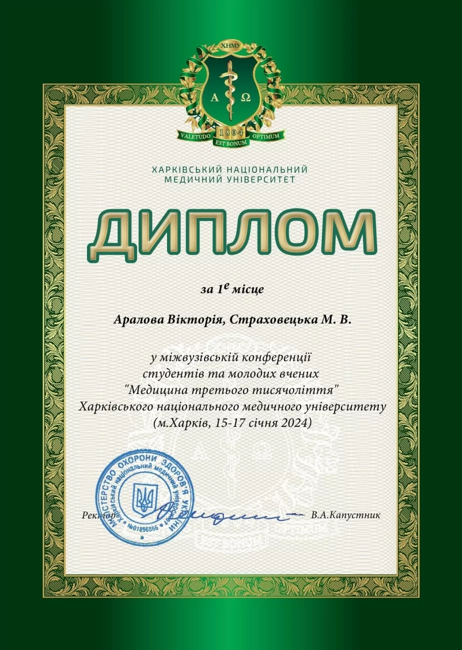 • She participated in the interuniversity conference of students and young scientists “Medicine of the Third Millennium”, which was held in Kharkov on the basis of the Kharkov National Medical University. This is confirmed by a diploma