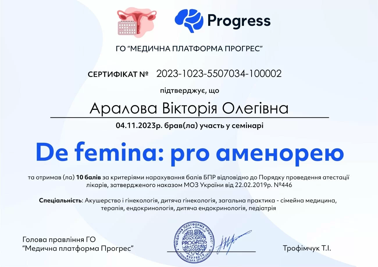 Took part in the seminar "De femina: pro amenorrhea", which is confirmed by certificate No. 2023-1023-5507034-100002