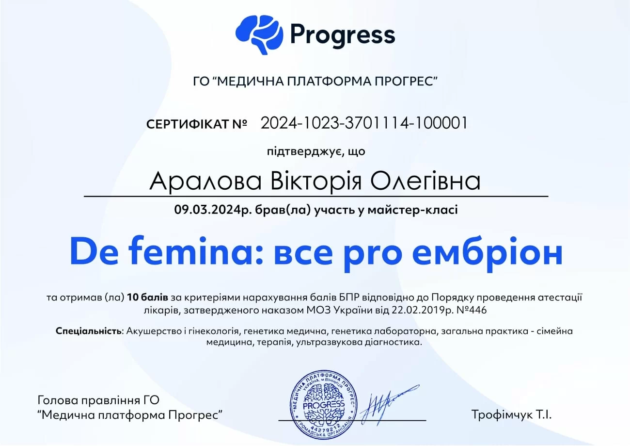 • Received certificate No. 2024-1023-3701114-100001 for participation in the master class “De femina: everything about the embryo”
