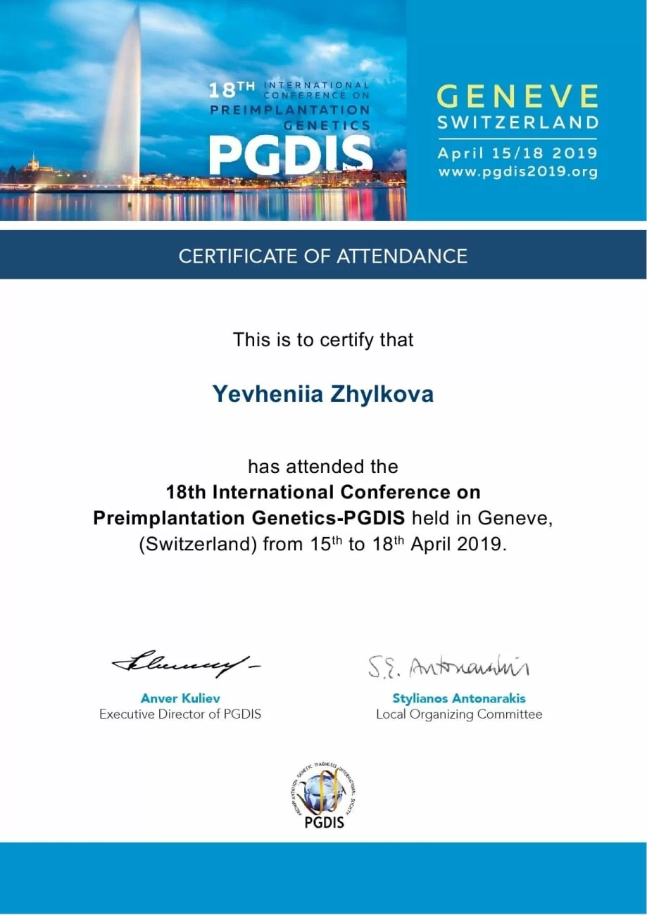 Participated in the 18th International Conference on Preimplantation Genetic Diagnosis in Geneva (Switzerland). Received a certificateApril 15-18, 2019